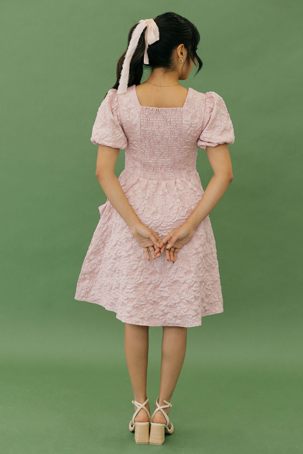 Smitten Dress – Pink is the perfect blend of playful charm and elevated detail. With its textured fabric and subtle metallic floral accents, this dress adds just the right amount of shimmer to your special moments.