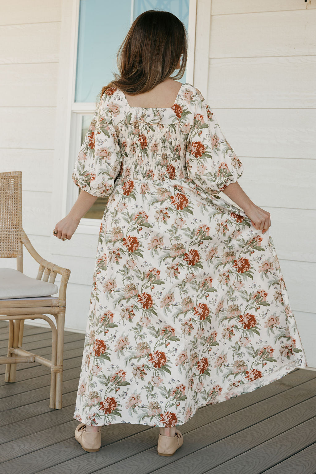 • Muted floral print in warm rust and soft green tones