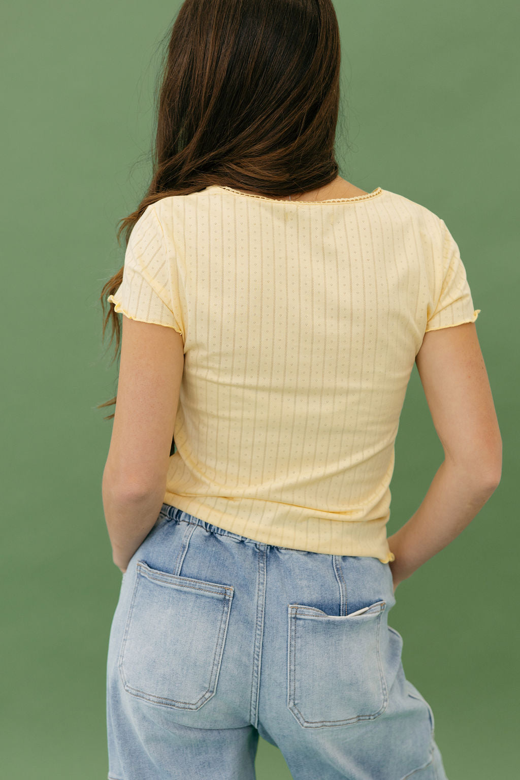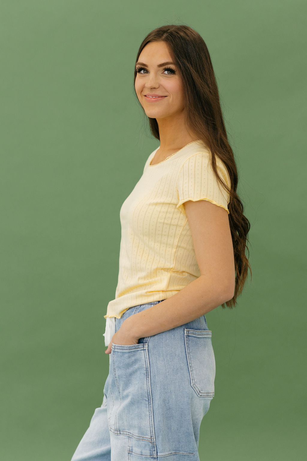 Geena Top – Butter Yellow is the soft, everyday essential your closet will thank you for. With its delicate lace trim and comfortable stretch, this fitted tee adds a feminine touch to your basics collection.