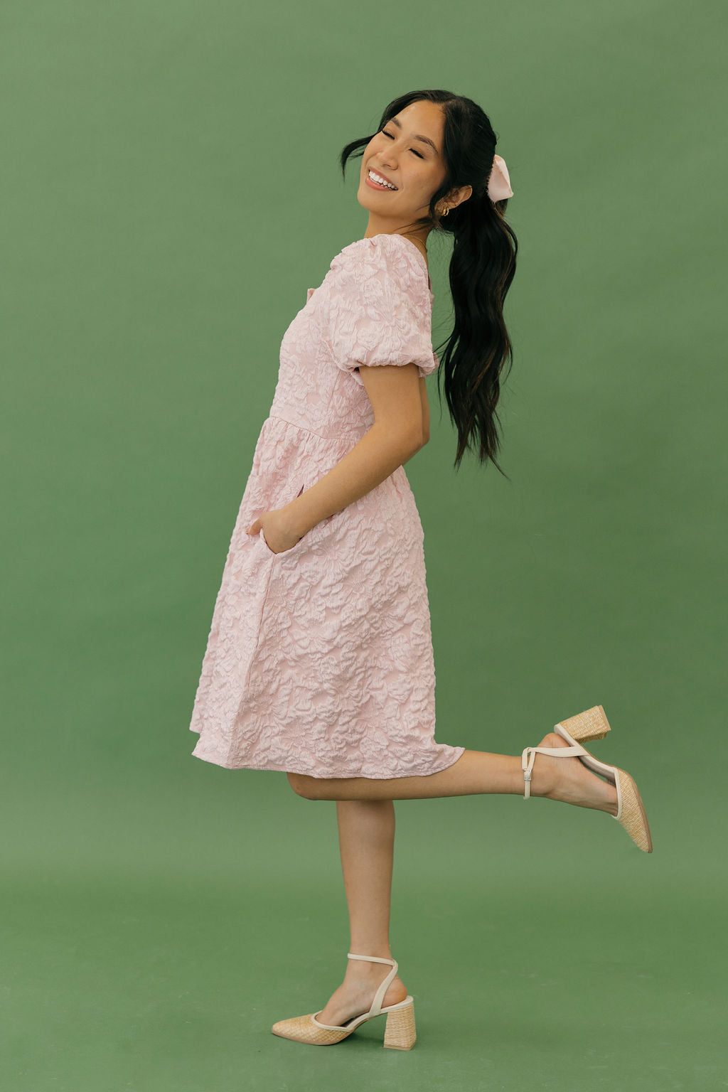 Smitten Dress – Pink is the perfect blend of playful charm and elevated detail. With its textured fabric and subtle metallic floral accents, this dress adds just the right amount of shimmer to your special moments.