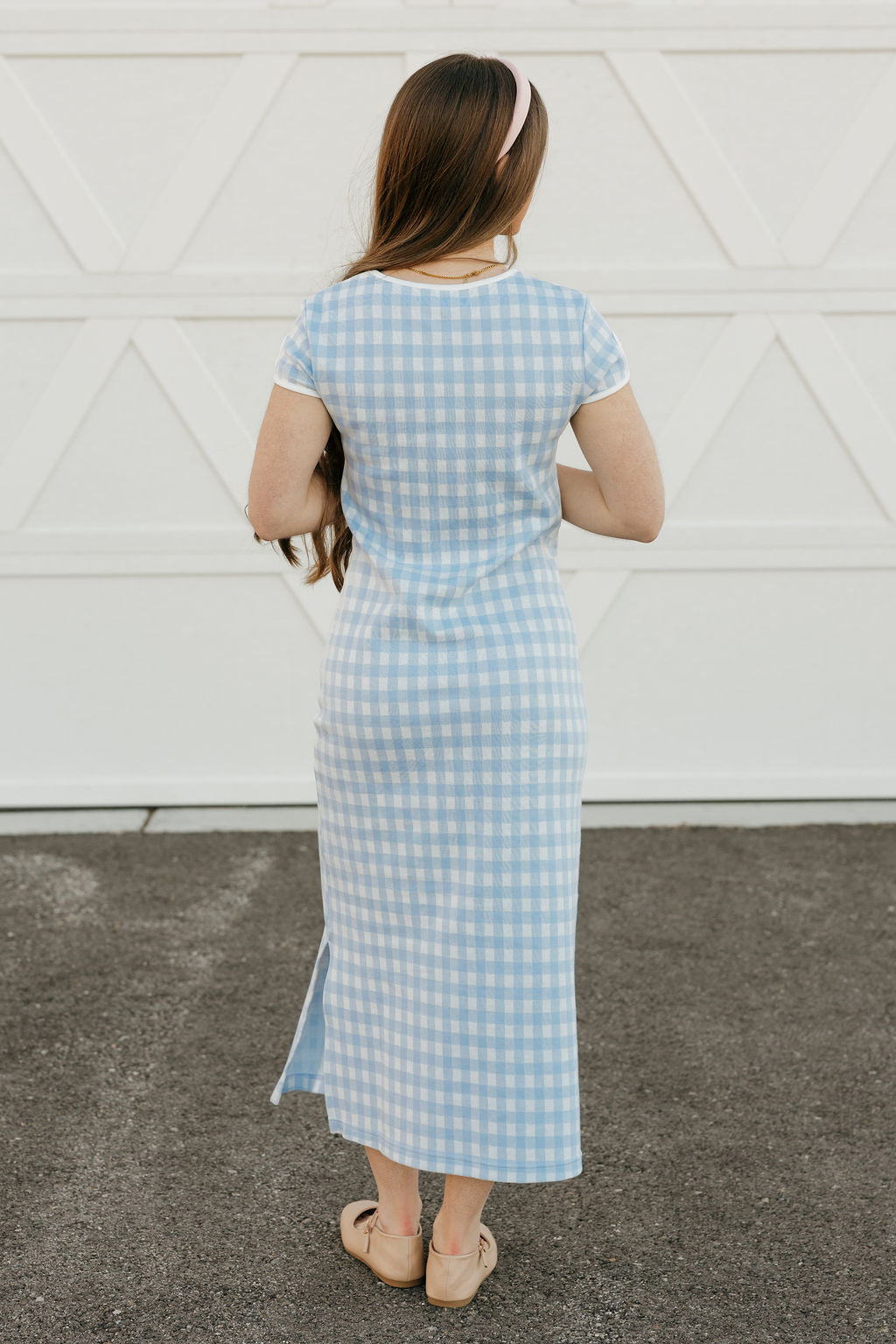 - Soft blue and white gingham print