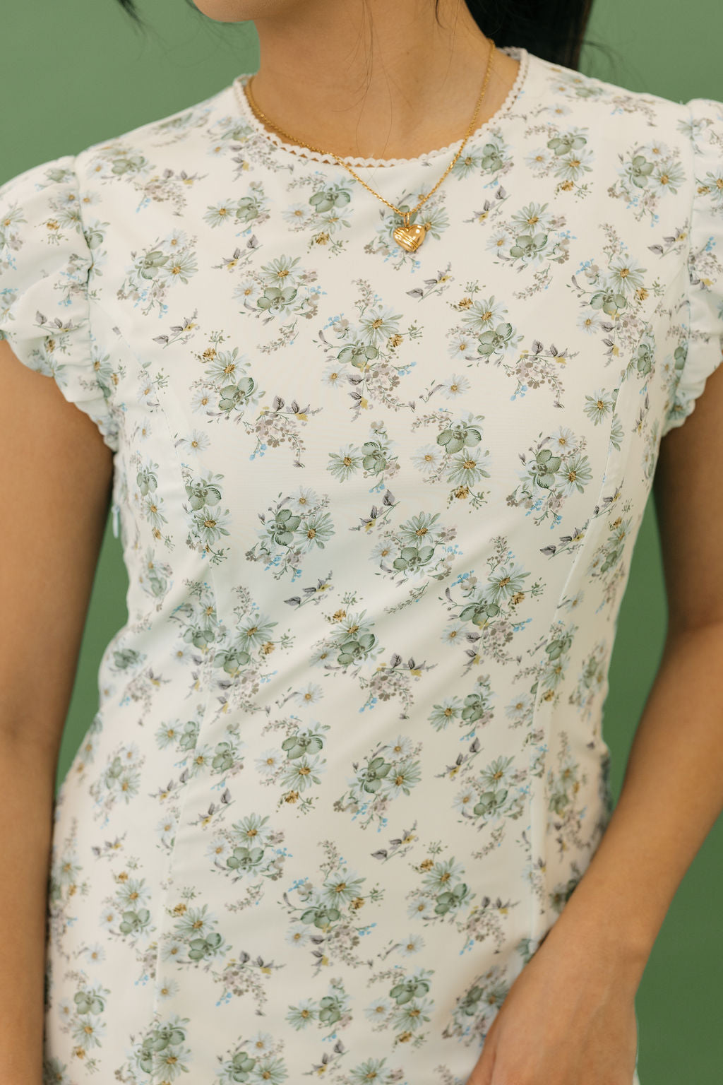 Designed with a clean, fitted bodice that skims the body comfortably and flows into a subtle flared skirt. The lightweight fabric feels soft and breathable, while the flutter sleeves add airy movement and soft structure through the shoulders. The silhouette feels polished yet easy to wear for all-day events.