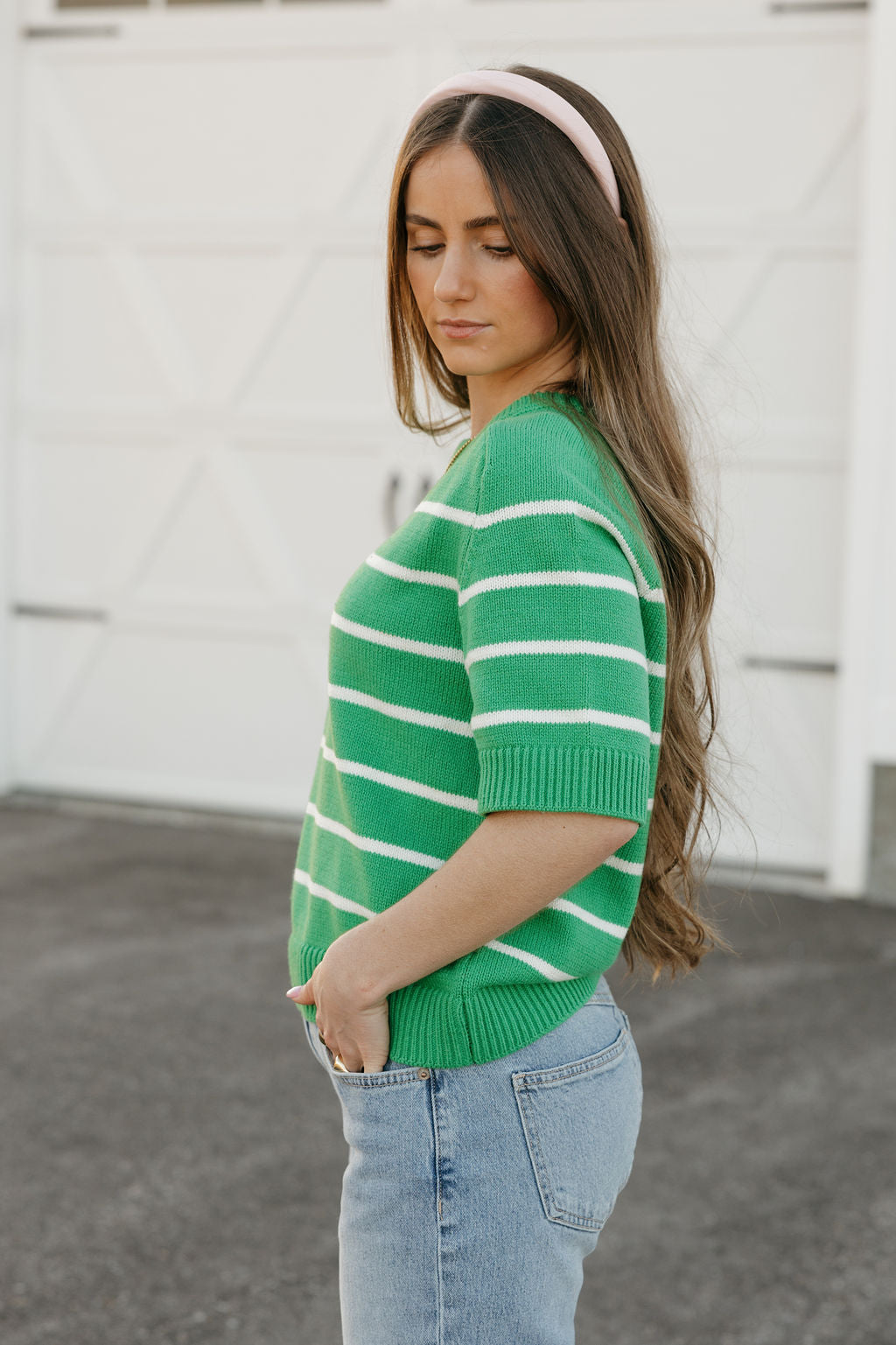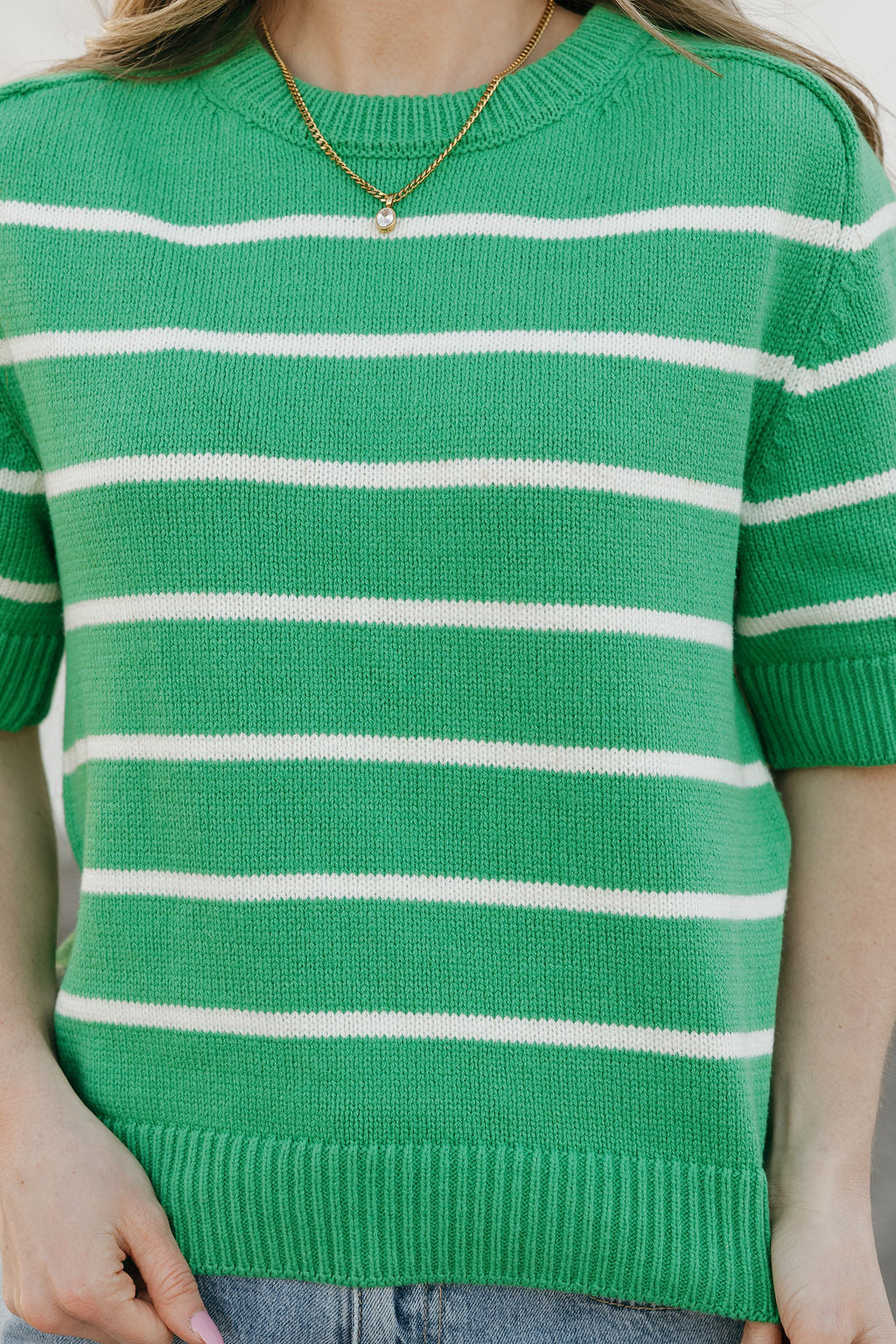 Cora Top – Green/Ivory is a fresh pop of color with timeless charm. The classic stripe pattern paired with a vibrant green hue makes this knit an easy standout for spring and beyond.