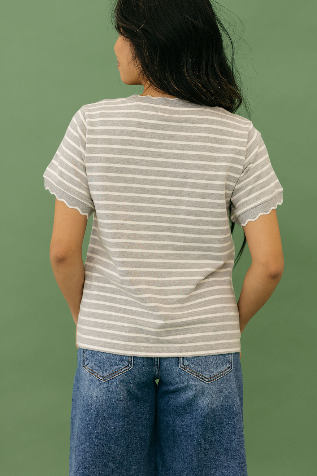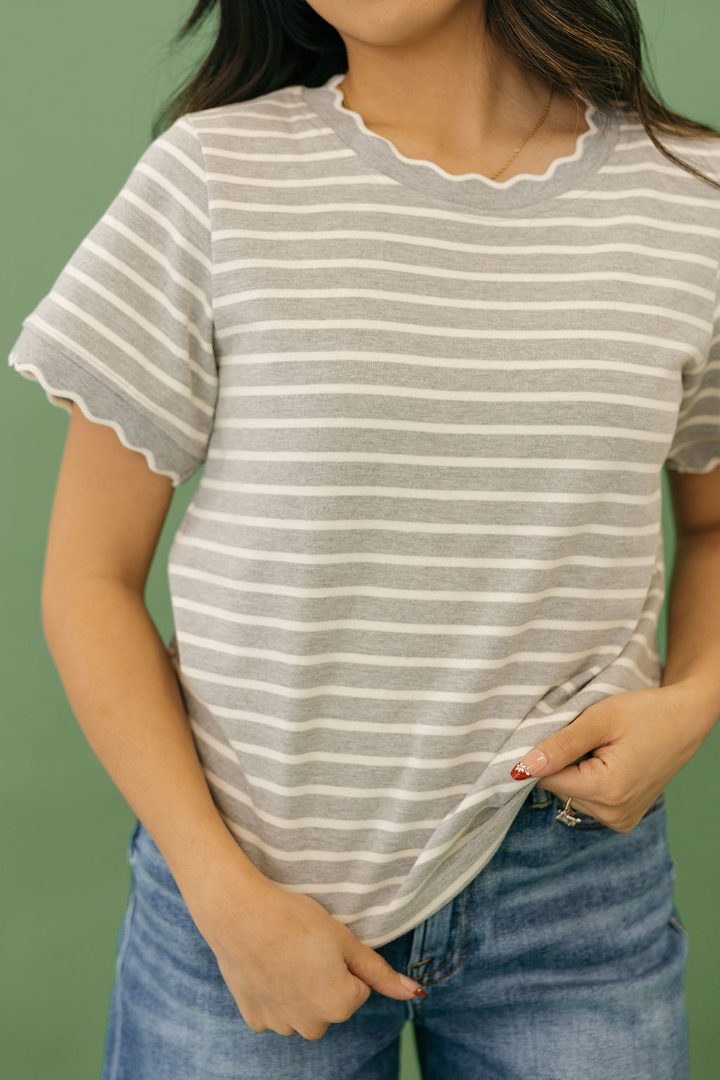 Mindi Top – Grey/Ivoryis a charming piece that brings together playful detail and everyday comfort. With perfectly scalloped edges and a fresh ivory and grey color combination, this top adds a sweet, polished touch to any outfit.