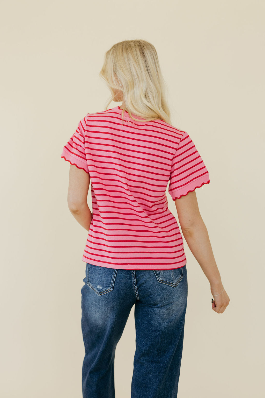 The Mindi Top in Red/Pink features perfectly scalloped edges that add a charming touch to your look. Its modest, non-see-through fabric keeps things comfy and confident, while the slightly cropped style offers a fun twist without revealing too much. Designed to be garment and maternity friendly, this top moves with you, making it a playful yet practical addition to your wardrobe.
